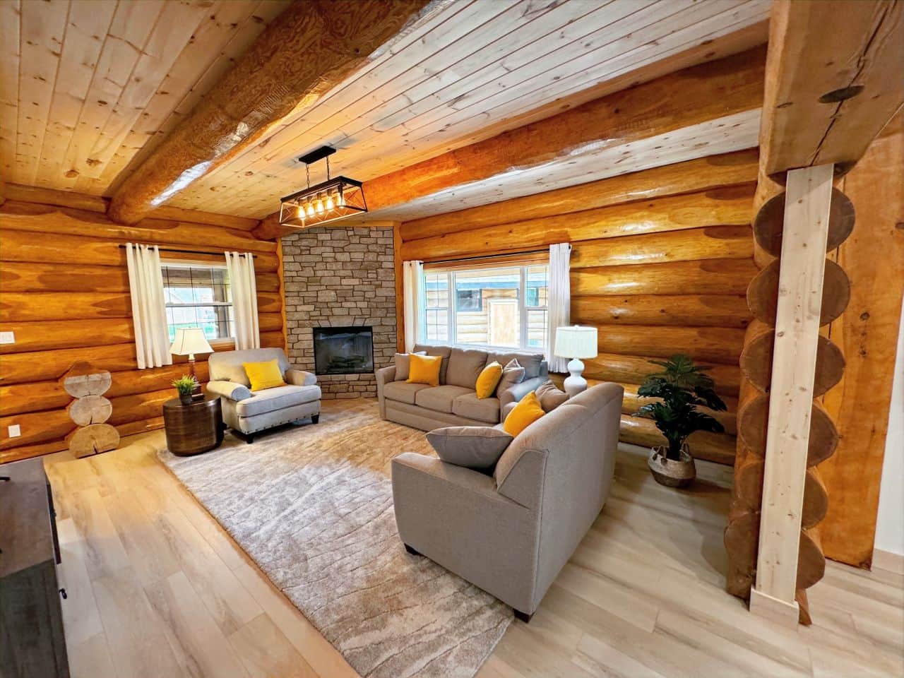 These new log cabins have 2 bedrooms, 2 bathrooms with large walk in tiled rain showers, full kitchen with dishwasher, quartz countertops, electric fireplace, laundry room. A/C and a 50” TV. There is a screened porch and a deck with a BBQ. 2 queen size beds and a sofa bed.